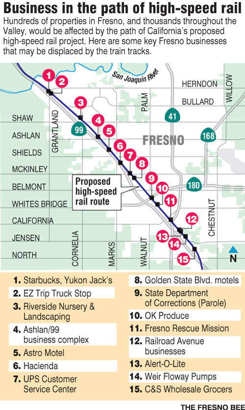 Mayor Ashley Swearengin said in a statement issued Tuesday: "The city has been working with the High Speed Rail Authority, local property owners and the Economic Development Corporation to, first of all, adjust the right of way to avoid as many businesses as possible and, second of all, make sure businesses are seamlessly re-located within the area if they are impacted.