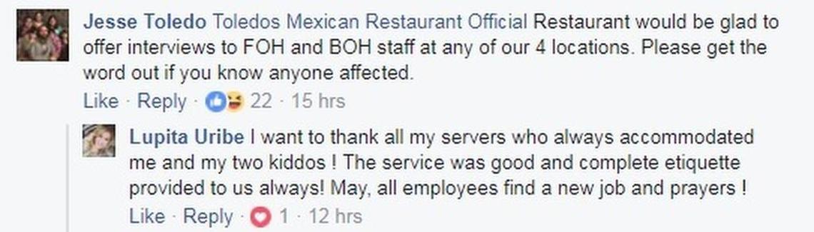 JEM Restaurant Management Corp.Jesse Toledo of Toledo’s Mexican Restaurants invited laid-off Elephant Bar workers to apply at any of its four restaurants. He welcomed people who had worked in either the front of the house (wait staff, etc.) or the back of the house (cooks, kitchen staff, etc.).