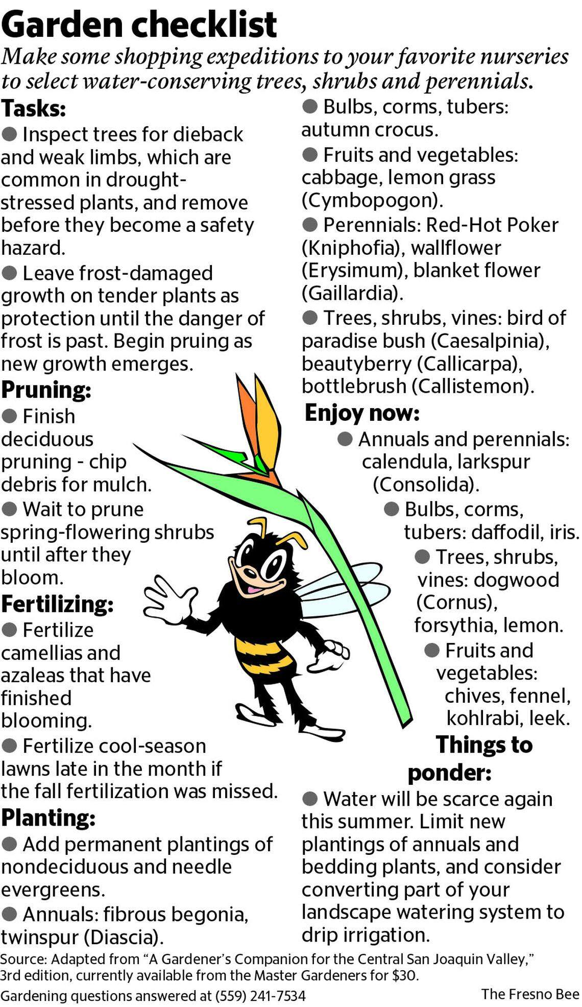 Here’s a schedule for fertilizing plants commonly found in our Valley gardens. If your plant or tree is not on this list, you should be able to find fertilization recommendations in Sunset’s “Western Garden Book” and in the Fresno County Master Gardener’s “A Gardener’s Companion for the San Joaquin Valley,” which is available at several local nurseries and at the UCCE office in Fresno.