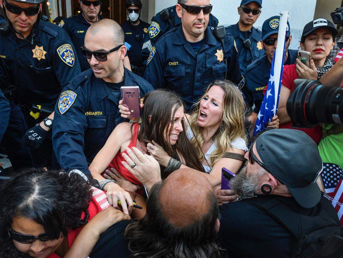 Groups including the Freedom Angels, V is for Vaccine and Stop Mandatory Vaccination have launched social media campaigns or rallied at the steps of the Capitol in Sacramento to protest against coronavirus health protocols and the not-yet-developed vaccine. The Freedom Angels have denounced Newsom’s mask mandate and told their followers not to comply.
