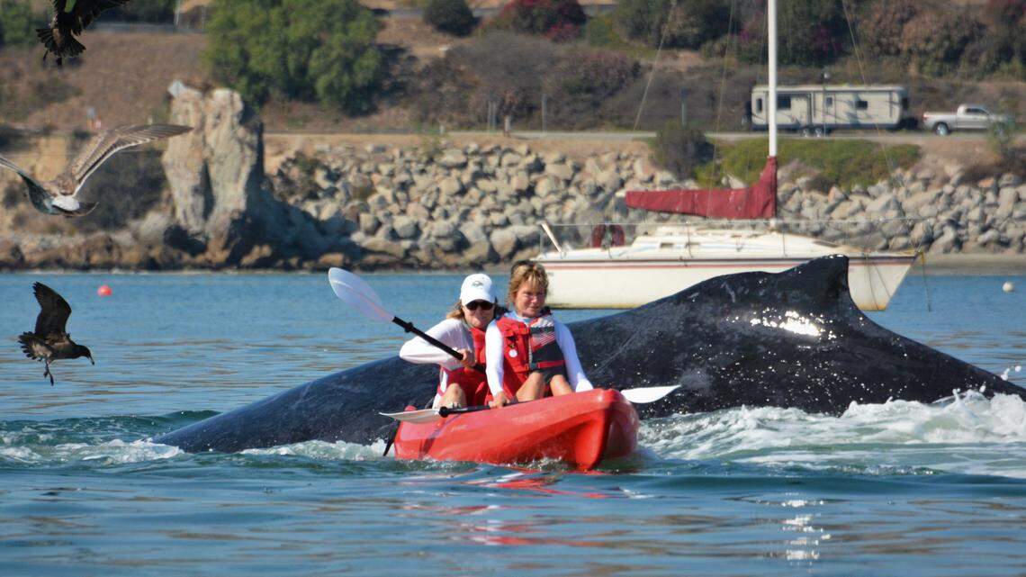 Two friends kayaking in the Port San Luis Harbor on Thursday had a close encounter with a humpback whale — and were lucky enough to have it captured on film.