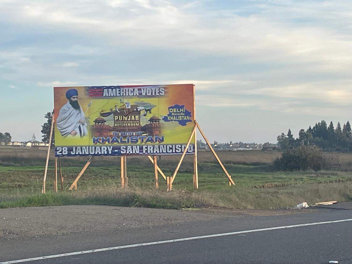 Just down the street from the gurdwara, on Bradshaw Road, a billboard promoting the Khalistan referendum shows a pious-looking Sikh underneath an American flag. The billboard declares, “America Votes, The Battle for Khalistan.”