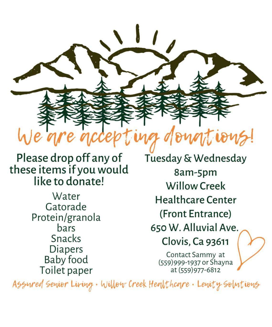 Assured Senior Living Solutions in Clovis is teaming up with Willow Creek Healthcare and Lenity Solutions to help provide important items including water, diapers, baby food and toilet paper to those impacted by the Creek Fire.