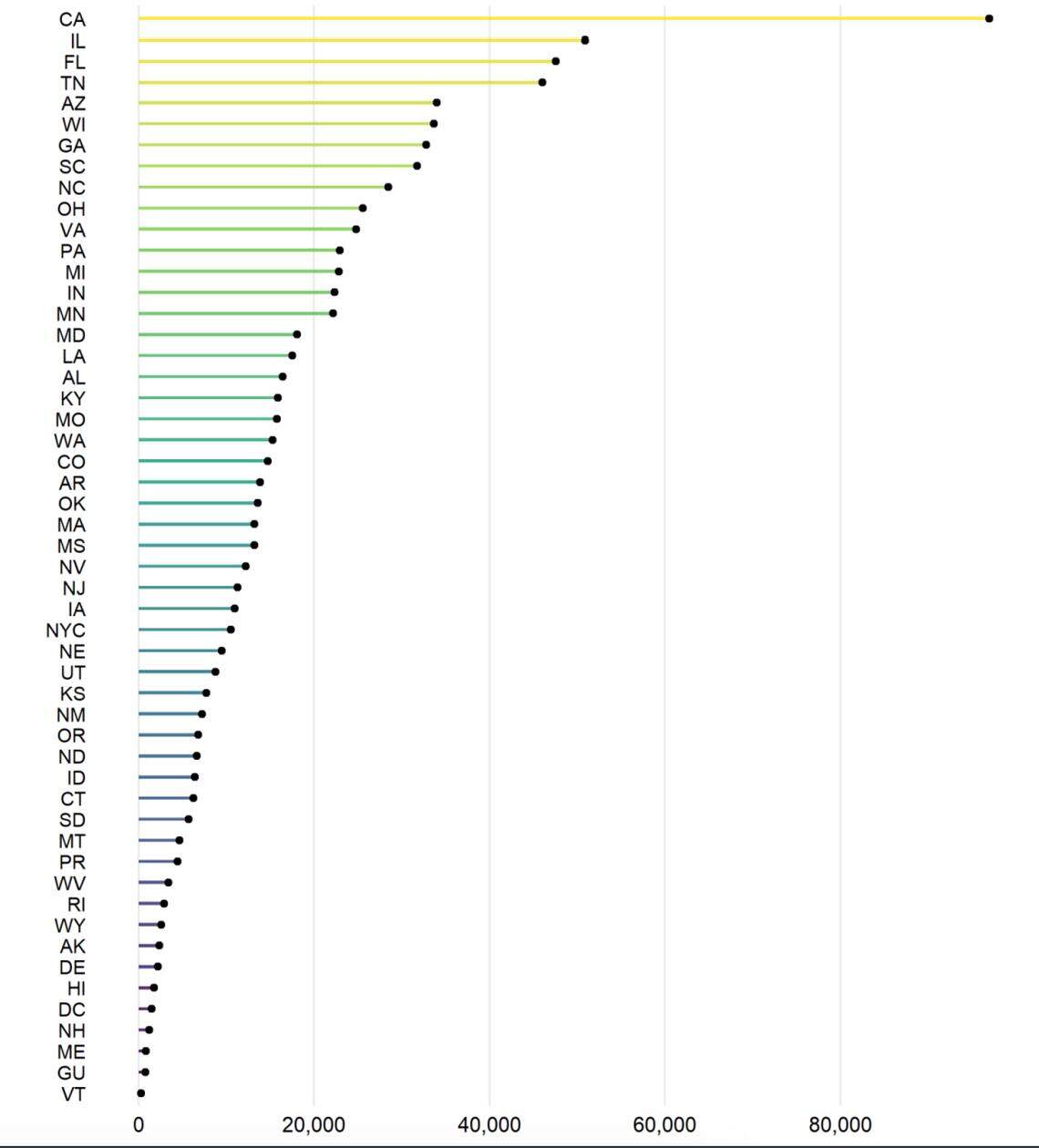 Ten states reported more than 25,000 child cases, while just two reported fewer than 1,000. The five states with the most cumulative number of infected children are California, Illinois, Florida, Tennessee and Arizona.