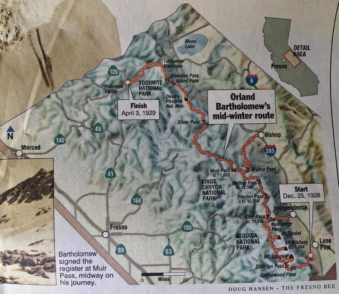 Four skiers retraced his winter route across the Sierra in 1999 and used the journey to campaign for an unnamed Sierra peak being called Mount Bartholomew.