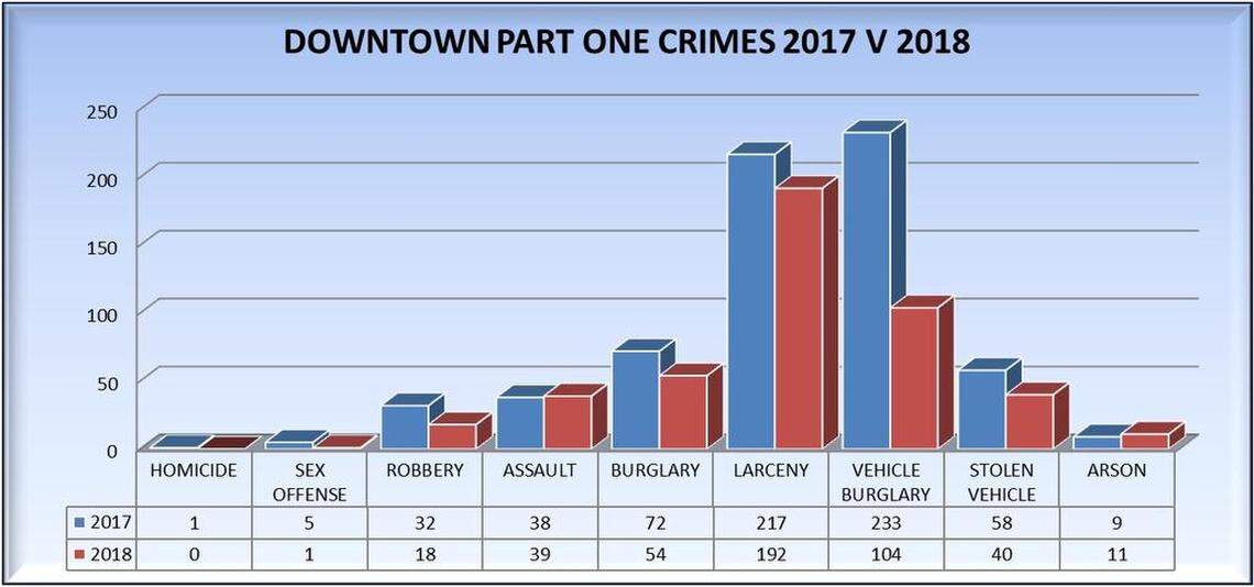 According to statistics from the department’s Downtown Policing Unit, crime was down in several key categories in 2018 – and by large margins. Vehicle burglaries, for example dropped by 55.4 percent. The number of stolen vehicles dropped 31 percent. Burglary was down 25 percent, larceny 11.5 percent and robbery 43.8 percent, according to the department.