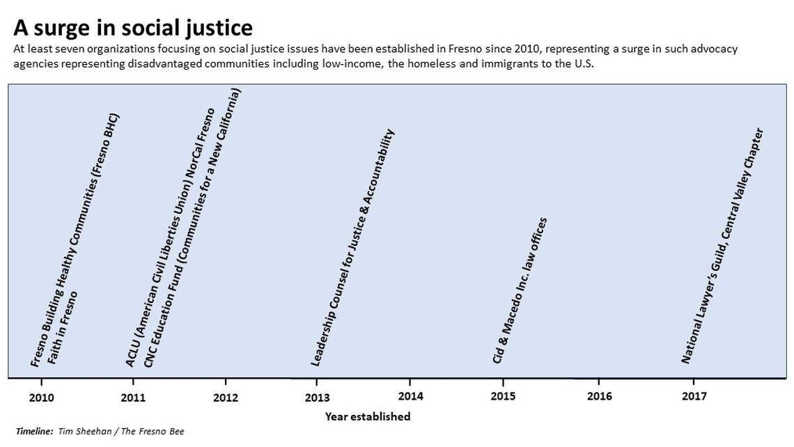 The story was based on a timeline beginning in 2010 when nonprofit organizations and new legal services began to locate in Fresno. Many people affiliated with those organizations were interviewed, along with several current and former politicians. Steve Brandau was the only politician who declined to be interviewed for this story.