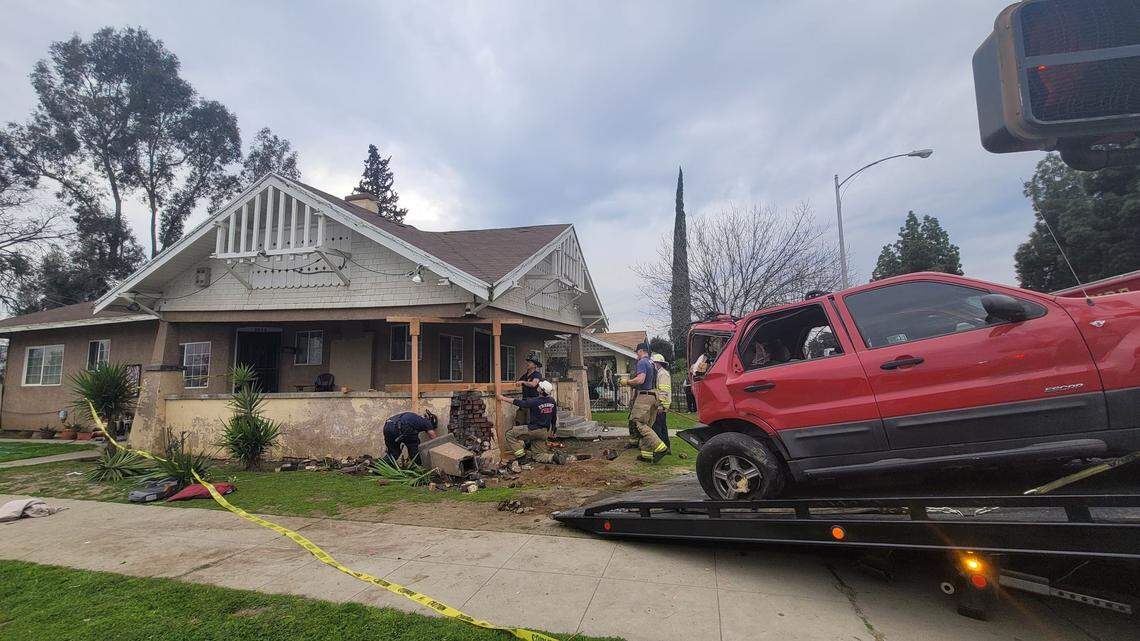 According to Fresno police Lt. Paul Cervantes, at around 3 p.m. officers received reports of a traffic collision at the intersection of First Street and Ventura Avenue. Officers arrived and found a Ford Escape crashed into the front porch of a home on the corner of the intersection.