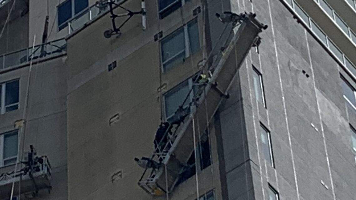 Dramatic photos show firefighters rescue window washers hanging from Texas high rise
