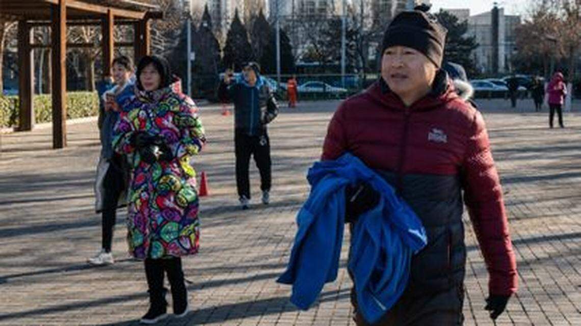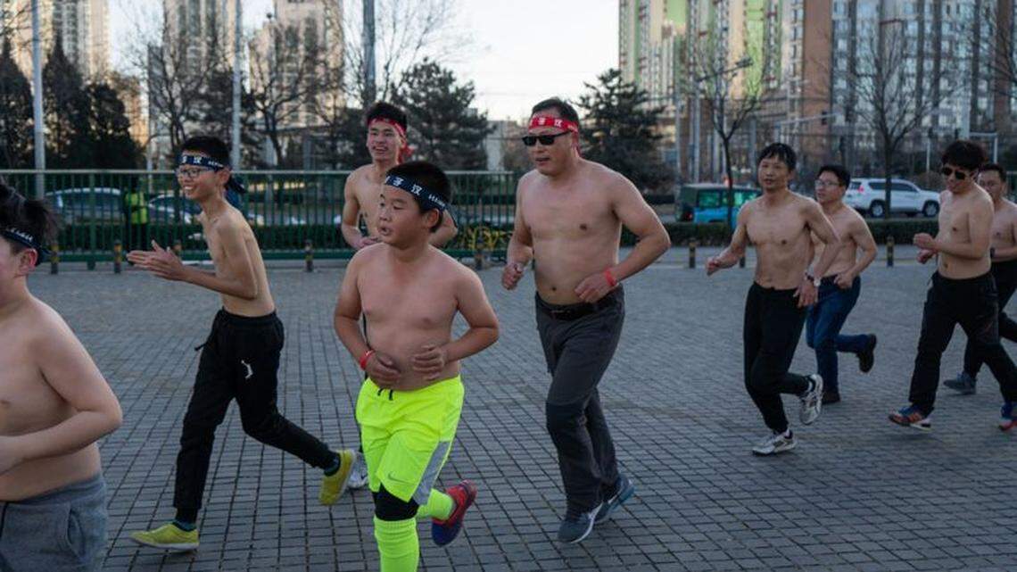 Beijing’s watery sunshine does nothing to take the bite out of the morning air, but it’s time for the boys to strip off their shirts. They hand them to their mothers, giggling and bouncing about, arms huddled to their chests, as their parents whip out phones for more photos.