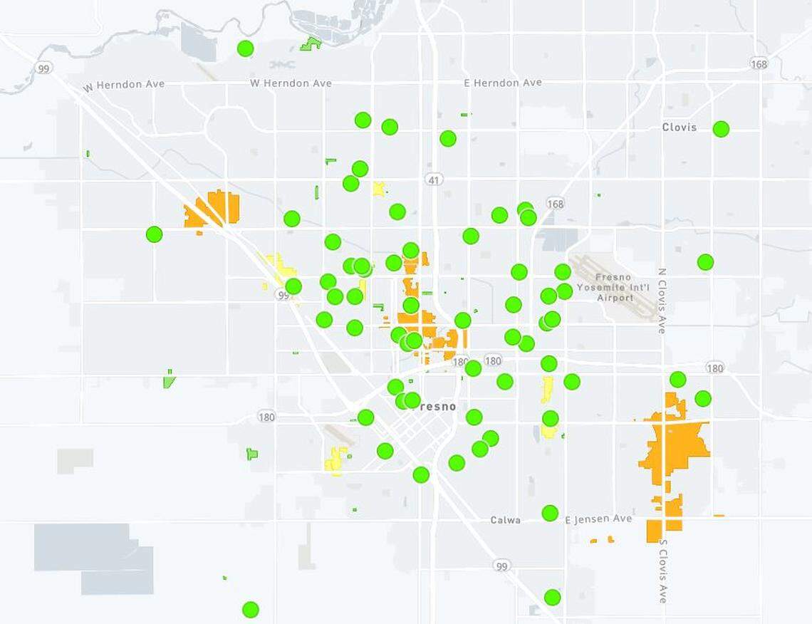 According to the PG&E Outage Map, outages have been reported throughout the city with a majority reported in central Fresno affecting 2,424 customers. PG&E spokesman Denny Boyles said that the outage in central neighborhoods was weather-related, but there was no time estimate for power restoration.