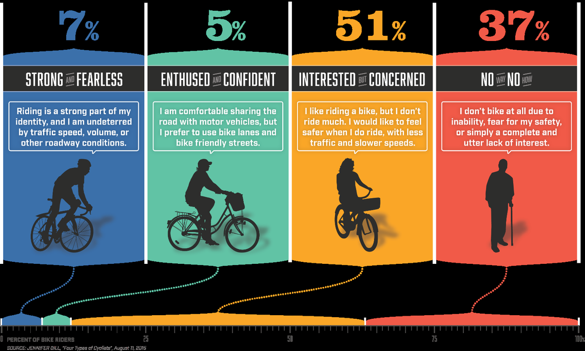 Those classified as “strong and fearless” (people who ride undeterred by car traffic or road conditions) numbered only 7 percent. The next group, “enthused and confident,” was even smaller at 5 percent.
